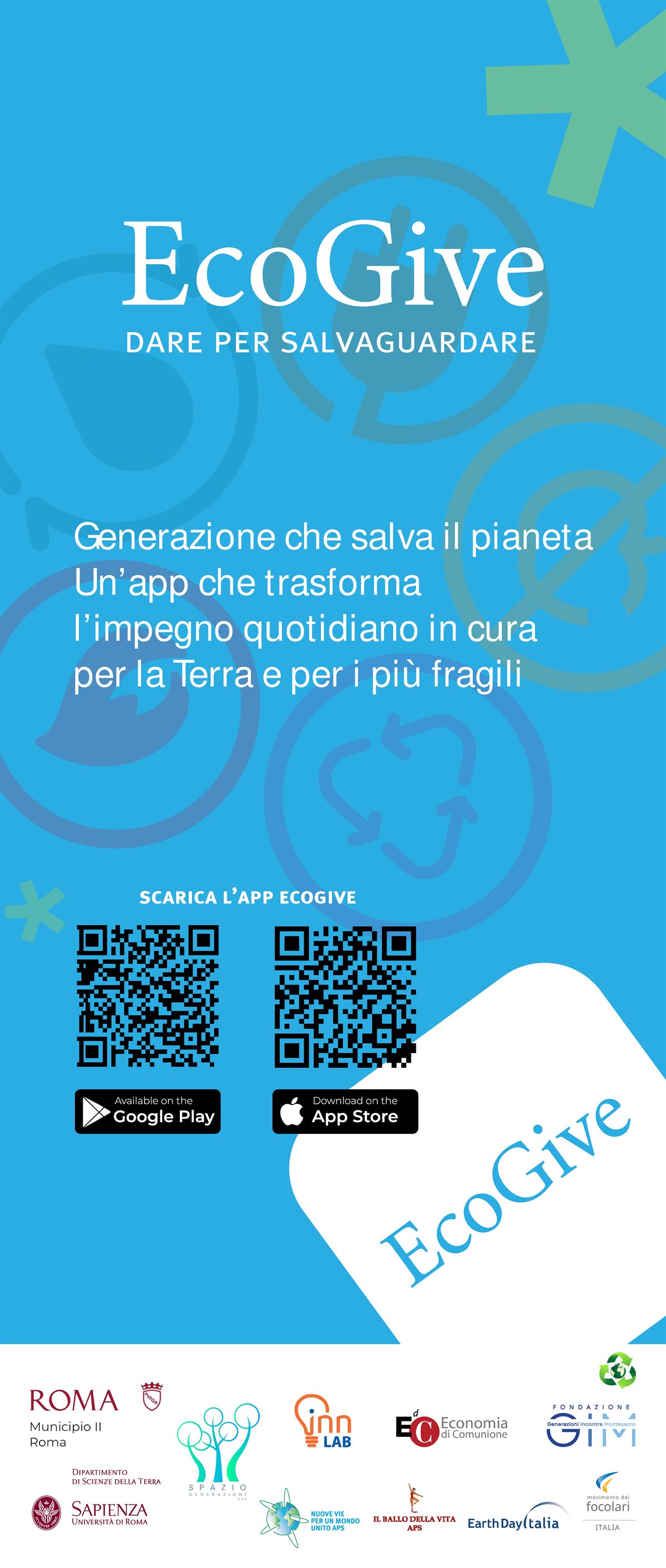 Con lo sviluppo dell'App EcoGive il progetto si apre a tutti: ragazzi, studenti e scuole, ma anche adulti, associazioni, gruppi di colleghi. L'App è disponibile su tutti gli store digitando ecogive.
