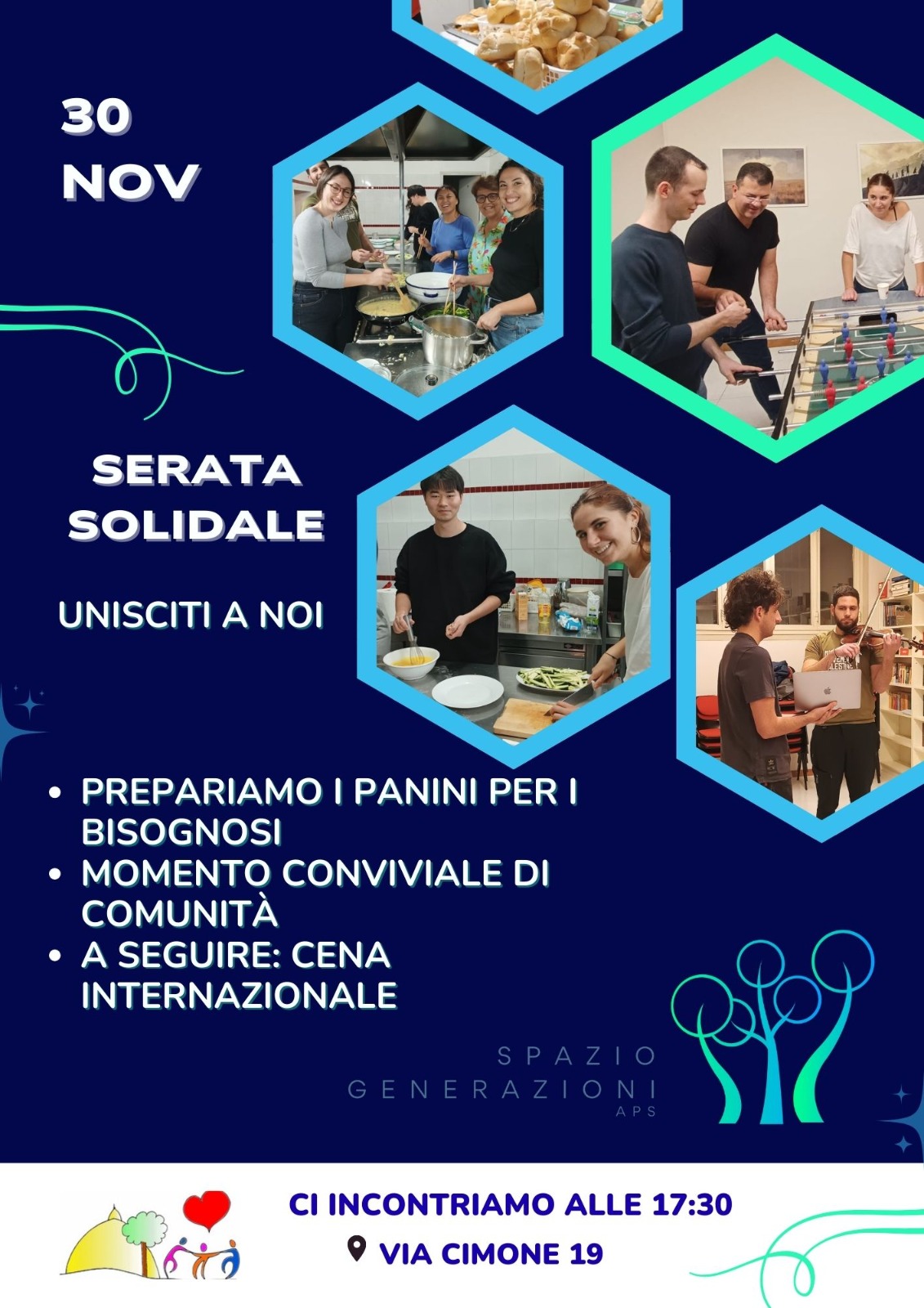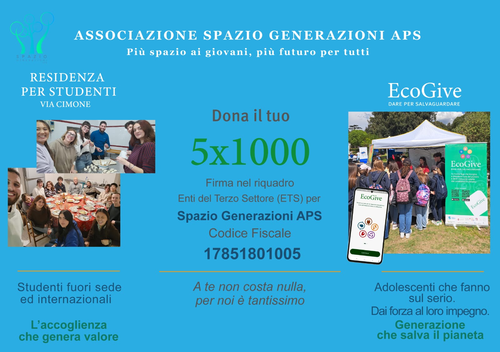 Siamo l'Associazione Spazio Generazioni APS, nata nel 2024. Guidata da giovani universitari fuori sede e internazionali, Spazio Generazioni APS unisce l'accoglienza abitativa alla sfida climatica (EcoGive — Dare per Salvaguardare) e all'inclusione e solidarietà (Serata solidale in collaborazione con RomAmoR Onlus).